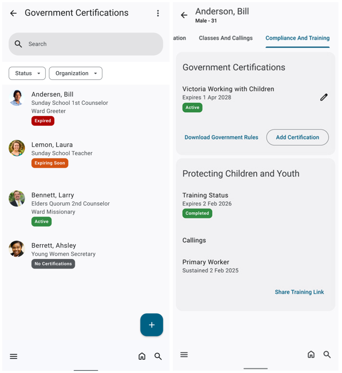 Una nuova sezione “Conformità e addestramenti” nei profili dei membri consente ai vescovati, alle presidenze di palo e agli archivisti di visualizzare e registrare le certificazioni governative relative a chi lavora con i bambini o con i giovani.