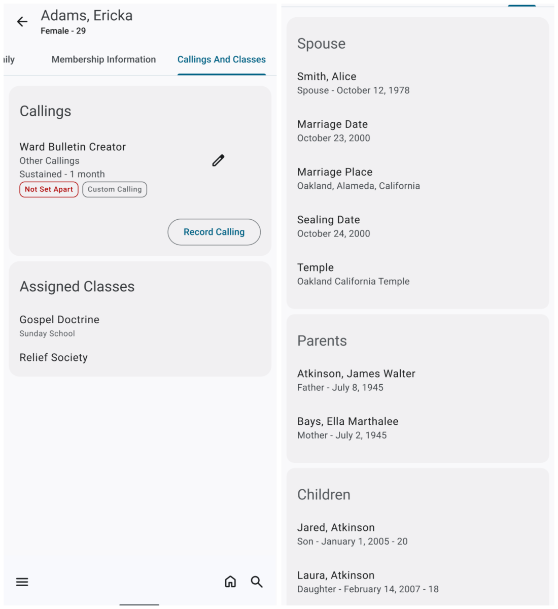 I dirigenti di palo e di rione ora possono registrare e aggiornare le chiamate dei membri direttamente nell’applicazione Strumenti per i membri (vedere l’immagine a sinistra nella figura qui sotto). In precedenza, questi cambiamenti dovevano essere apportati tramite Risorse per i dirigenti e per l’archivista sul sito della Chiesa. Ora, i dirigenti possono gestire le chiamate immediatamente, consentendo ai membri di accedere agli strumenti e alle risorse per la loro nuova chiamata già 24 ore dopo.