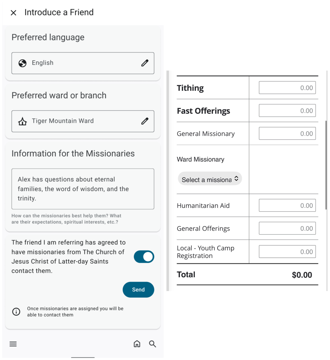 Quando utilizzano la funzione “Presentare gli amici ai missionari” all’interno dell’applicazione, i membri ora possono selezionare un rione o ramo specifico quando inviano il modulo (vedere l’immagine a sinistra nella figura qui sotto).