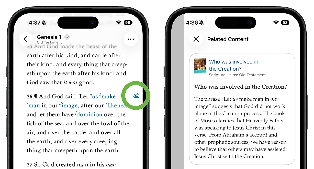 - Registrazioni audio: le registrazioni audio delle Scritture e di alcune delle risorse sopra menzionate sono disponibili in lingue selezionate per favorire una maggiore accessibilità e comprensione del Vangelo. I membri possono ascoltare facilmente le registrazioni toccando il pulsante delle cuffie in basso a destra dello schermo.