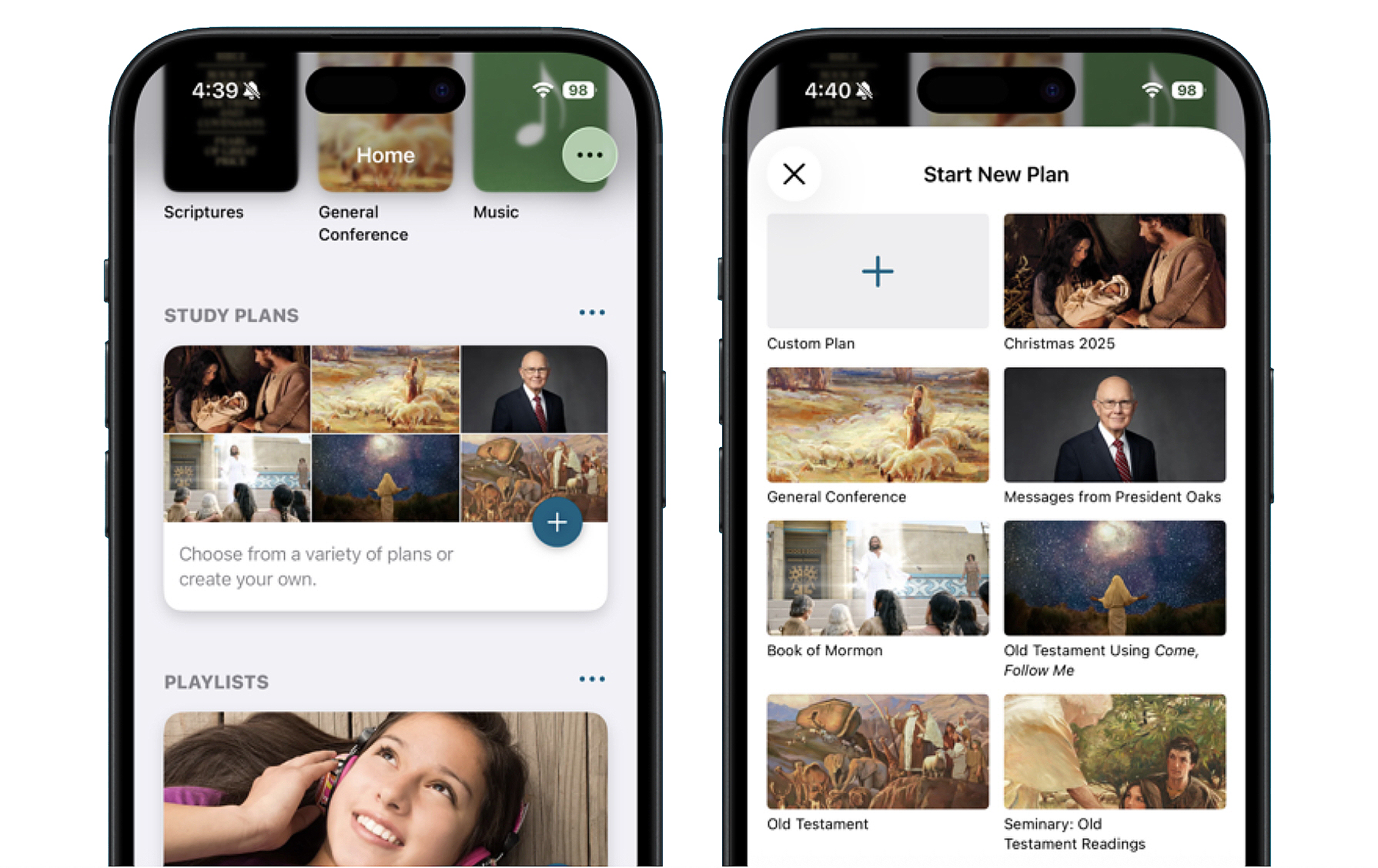 - Piani di studio: i piani di studio nella Biblioteca evangelica aiutano gli utenti a impostare un programma per lo studio di qualsiasi contenuto dell’applicazione. Oltre a crearne di personalizzati, i membri possono utilizzare tre piani forniti dalla Chiesa che supportano lo studio dell’Antico Testamento: